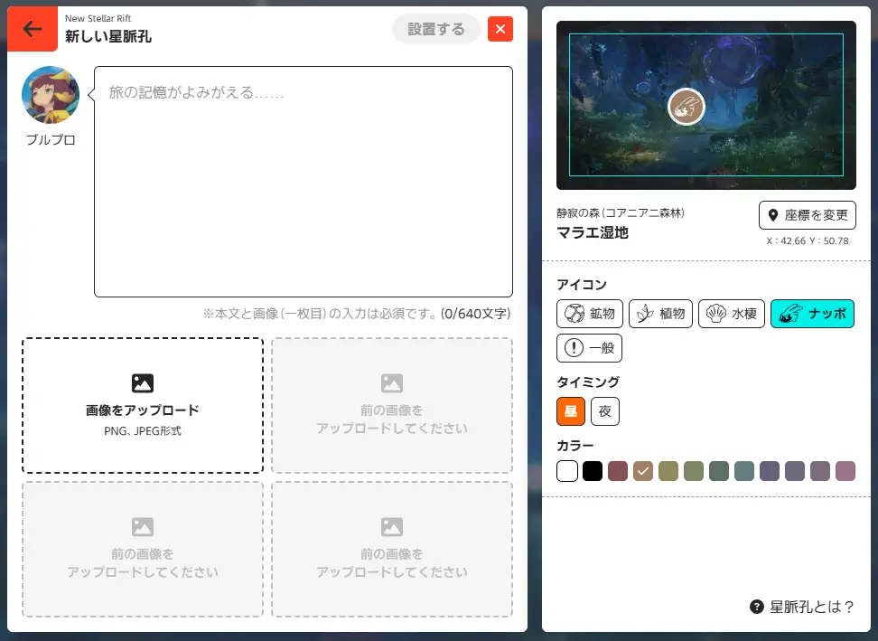 1つの星脈孔に各自2つまで、スタンプか定型文を残せます。