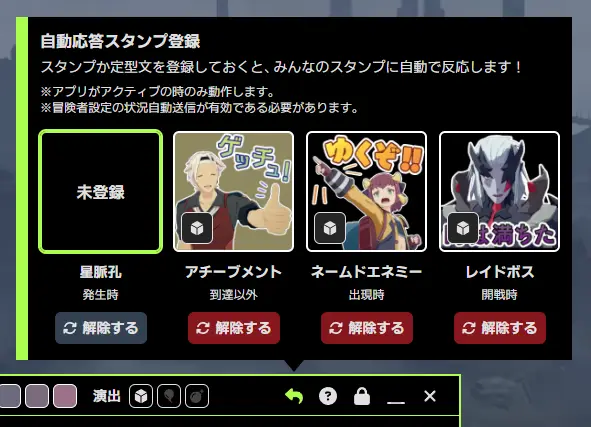 システムに分類される内容は自身にだけ表示されます。自動応答スタンプ登録に星脈孔の枠が増えました!